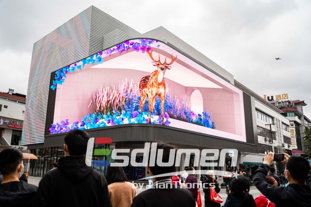 With a total area of 306 sqm, this set of naked-eye-3D-effect curved LED wall was assembled by Esdlumen flagship product FS4 Series outdoor LED display, carrying an ultra-high-resolution of 9960*1920 to deliver more delicate and exquisite images.